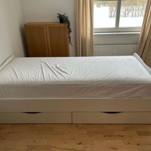 IKEA sengestel med skuffer i hvid. Sengen har integreret opbevaring med fire store skuffer under liggefladen, som kan bruges til sengetøj, tøj eller andet opbevaring. Enkel og funktionel seng i neutralt design, der passer ind i de fleste soveværelser eller værelser. Brugt/som ny - ingen synlige brugsspor. Sælges grundet flytning.