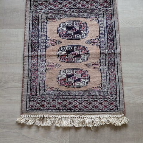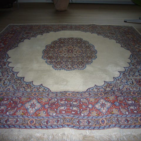 Smukt tæppe i bka rødlige farver måler 100 x 96 cm. Se mærke på billederne. Fra ikke ryger hjem.