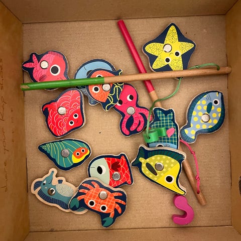 Magnetfiske spil fra Djeco sælges. Tilhørende magneter og fiskestænger. Hjørnerne på æsken er tapet sammen men magneter og fiskestænger er intakt.