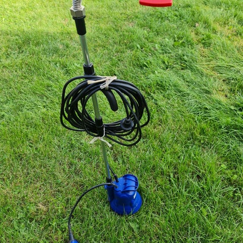 Der er en pumpe med til hver ,den grønne er på 350W og den anden er på 1100W og diverse tilkoblings slanger som kan monteres imellem tønderne ,så der kan pumpes imellem dem og tilsluttes vandslange som ikke medfølger.