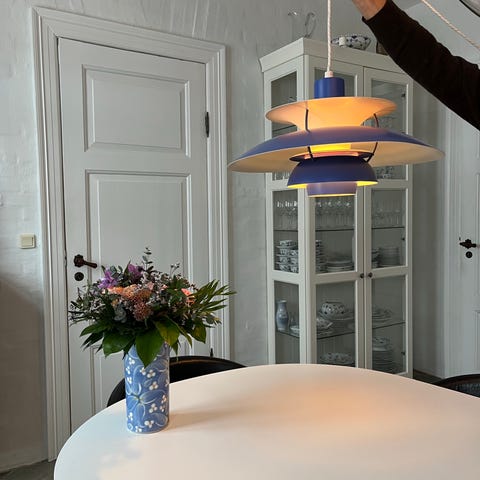 Louis Poulsen PH pendel designet af Poul Henningsen. Loftlampen er opbygget med flere skærme, der giver et blændfrit og nedadrettet lys. Yderskærmen fremstår i sort, mens de indvendige skærme er hvide for at sikre en jævn lysfordeling. Lampen er beregnet til montering i loft med ledning og fatning i toppen og egner sig til belysning over bord, i stue, køkken eller gang.