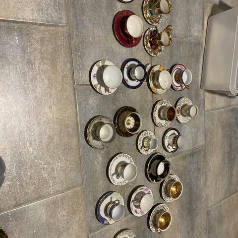 Otte retro kopper fra England med glasindsats og plastikhanke i orange og grøn. Kopperne består af klare glasindsatser, der står i ydre holdere af plastik med hank. Egnet til servering af varme drikke som te eller kaffe.