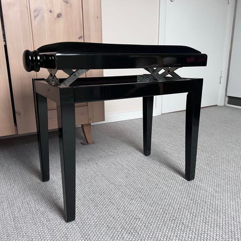 Piano bænk med polstret sæde i brun stof. Bænken har fire buede træben og er velegnet som siddeplads ved klaver eller orgel. Klassisk design, der passer til traditionelle instrumenter og indretninger.