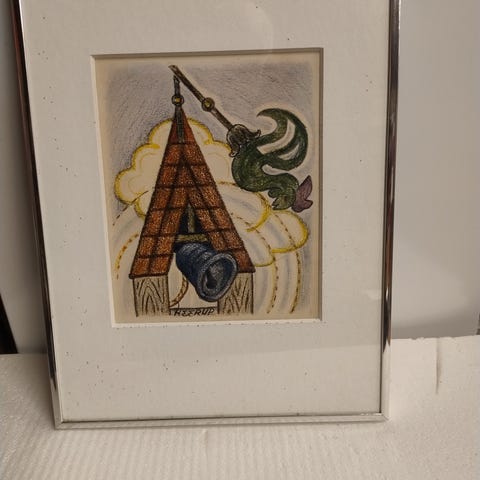 Heerup kunstner farverige tryk med middelaldermotiver i træramme. Motiverne viser figurer i rustning, hest og personer i kostumer i en stiliseret, grafisk streg. Begge værker er indrammet med lys passepartout og enkel træramme. Egnede til ophængning i stue, gang eller værelse som dekorativ vægkunst.