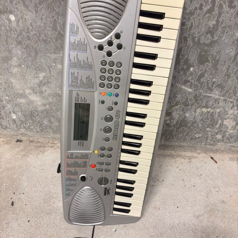 Medeli M12 elektronisk keyboard med 61 tangenter i grå farve. Keyboardet har indbyggede højttalere, display med baggrundslys og forskellige funktionsknapper til lyde, rytmer og indstillinger. Egnet til øvning og hjemmebrug, både for begyndere og let øvede. Kan tilsluttes strøm via medfølgende strømkabel/adapter, som ses på billederne.