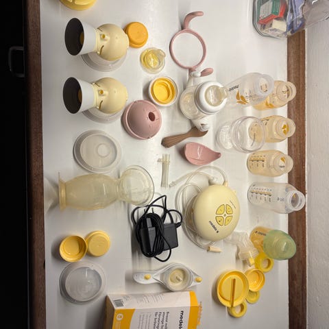 Medela Swing Maxi Flex elektrisk dobbeltbrystpumpe med tilhørende flasker og tilbehør.