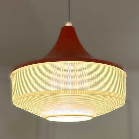 ROTAFLEX pendler af plast. Ø. 28, H. 16 cm. Designet omkring 1970. Lamperne har lidt småpletter på kantbåndet, og mindre afslag på plast på ikke synlige steder.