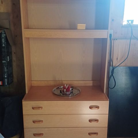 Reol med kakkelbord robust i massiv bøg måler 80 x 38 cm. praktisk med 2 skuffer. Sælges for 175 kr.