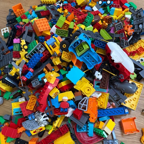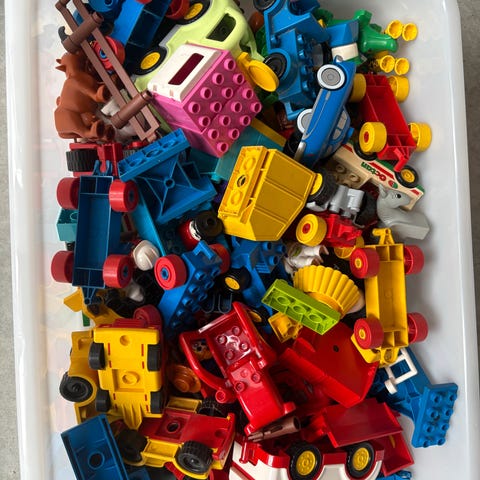 Et lego tivoli med tog, karussel mm, et Anna slot, en stor plade og et sæt m hvaler og fisk