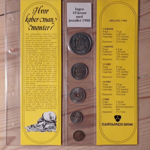 1 kroner fra 1960 til 2000, men 1974, 90, 91 og 92 mangler. Møntsamlinger i plastlommer til ringbind. Mønterne er placeret enkeltvis i gennemsigtige lommer, som gør det muligt at se begge sider.