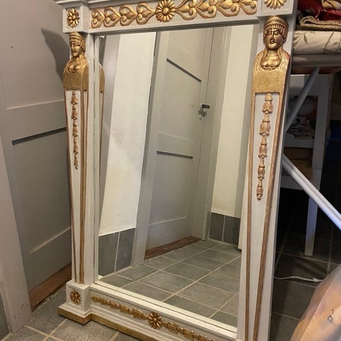 &Tradition rektangulært spejl med guldfarvet ramme. Spejlet er og egner sig til brug i entre, soveværelse eller garderobe. Klassisk ramme med profileret kant, der kan passe ind i forskellige indretningsstile.