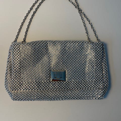 skuldertaske til kvinde i metallisk materialer. Tasken har en kæderem og et ydre i små skinnende plader, som giver en struktureret overflade. Indvendigt er der foer samt en mindre lynlåslomme til opbevaring af småting. Egnet som mindre taske til hverdag eller brug ved festlige lejligheder, hvor der er behov for at medbringe nødvendige ejendele som telefon, nøgler og pung.