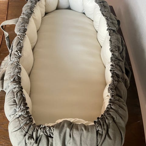 Sebra babynest i bløde tekstiler. Yderside i brun nuance og inderside i lys beige med diskret mønster. Babynesten har polstrede kanter hele vejen rundt og madras i bunden for ekstra komfort. Udstyret med bærehanke i siderne, så den er nem at flytte rundt i hjemmet. Velegnet til spædbørn som tryg sove- og hvileplads på sofa, seng, barnevogn eller gulv.