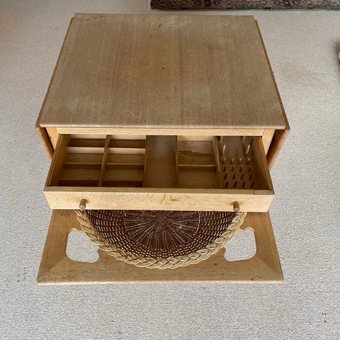 Sybord i eg med integreret fletkurv under bordpladen. Bordet står på ben med hjul, så det er let at flytte rundt. Bordet kan anvendes som sybord eller opbevaringsbord til mindre genstande og håndarbejde. Designet er enkelt med rektangulær bordplade og praktisk kurv til opbevaring.