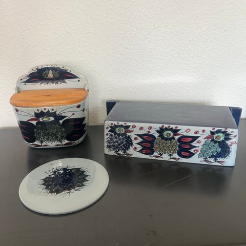 Royal Copenhagen fajance køkkenrulleholder med dekoreret fuglemotiv på forsiden. Navs Beth Bremen 1968. Holderen er udført i fajance med overglasurdekoration i flere farver og har en træstang til køkkenrullen. Velegnet til vægmontering, da der er ophængshuller på bagsiden. Bunden er stemplet Royal Copenhagen Denmark og mærket fajance.