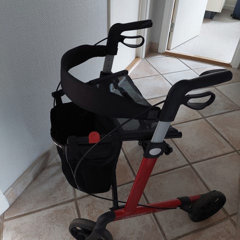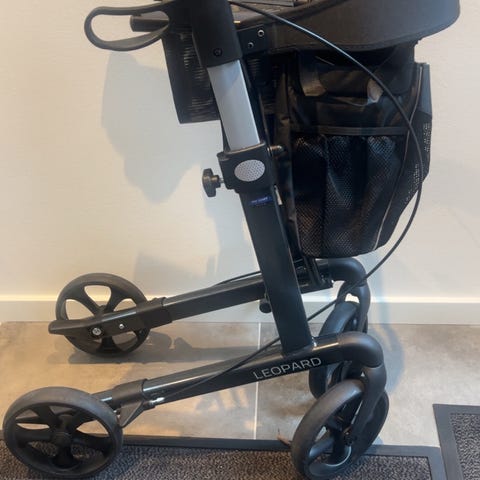 Leopard rollator fra Mobilex i sort. Rollatoren har fire softhjul, håndbremser på begge håndtag og integreret sæde. Der medfølger aftagelig taske under sædet til opbevaring af personlige ejendele. Velegnet som ganghjælpemiddel både indendørs og udendørs. Justerbare håndtag giver mulighed for tilpasning til brugerens højde. Sædehøjde er 62 cm.