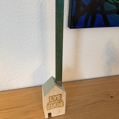 Motivet er lasergraveret direkte i træet, og “skorstenen” fungerer som holder til et almindeligt kronelys.