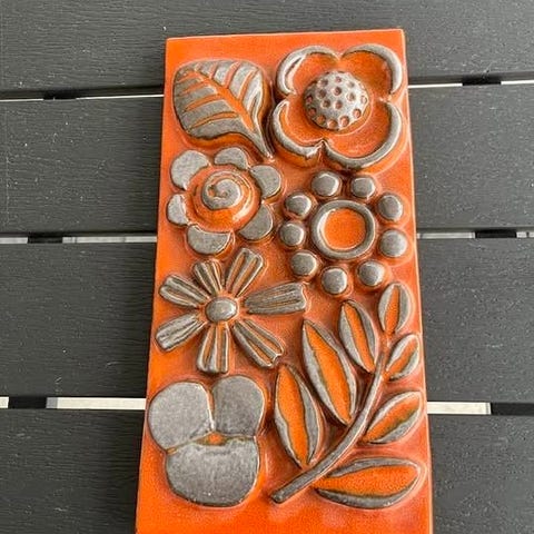 Rektangulært keramisk relief med motiv af blomster i flere farver. Relieffet har et blomsterdesign med røde, blå, hvide og grønne nuancer på en mørk baggrund. Egnet som vægdekoration i for eksempel stue, køkken eller entré. Kan bruges alene eller sammen med andre keramiske relieffer som en del af en billedvæg. (Kan sendes eller afhentes).