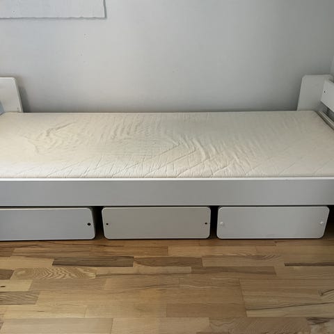 Emil juniorseng fra Ilva (str 86cm /210cm ) plus 2 styks EMIL underskuffer tll opbevaring. Der er hjul på. Alt er godt brugt, men fungerer meget fint.