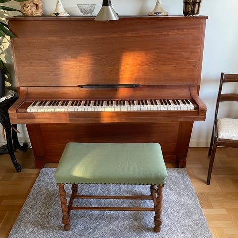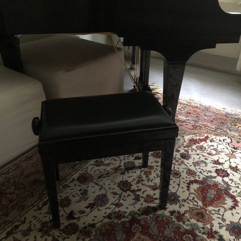Justérbar klaverbænk i sort. Bænken har polstret sæde og mekanisme til højdejustering via drejeknapper i siden. Velegnet til brug ved klaver eller keyboard, hvor der er behov for at kunne tilpasse siddehøjden. Klassisk, enkel konstruktion med fire lige ben og rektangulært sæde i sort finish.
