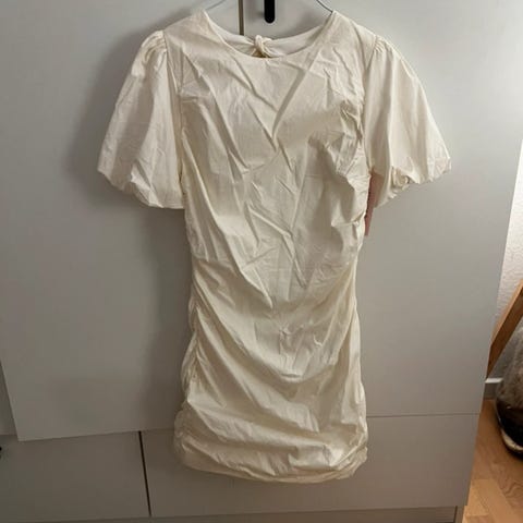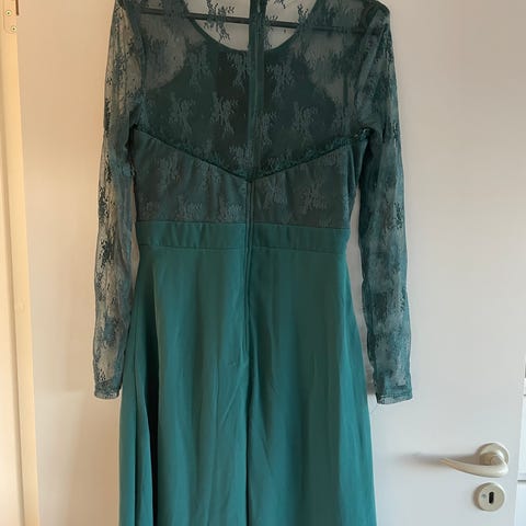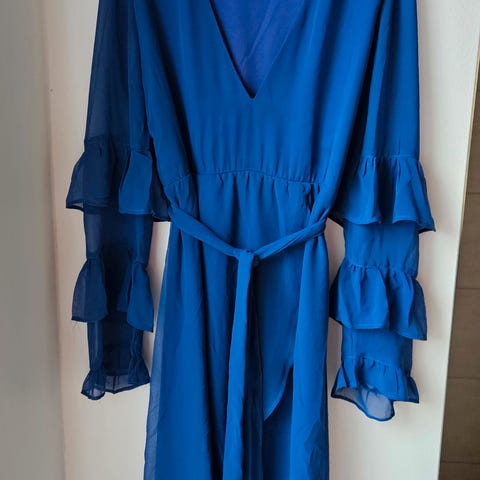 Nelly fest/cocktailkjole i blå, i størrelse M. Kjolen er uden ærmer med rund halsudskæring og et kropsnært snit. Den har et markant mønster foran og bagpå med dekorative perle- eller pailletdetaljer samt frynser nederst. Velegnet til festlige lejligheder som cocktailfester, nytår eller andre arrangementer, hvor en mere pyntet kjole ønskes.