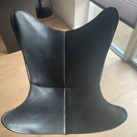 Stor flot flagermusestol i sort læder - med lidt slid.