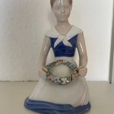 Porcelænsfigur formet som en siddende kat i blå-hvide nuancer. Figuren forestiller en kat med løftet hoved.