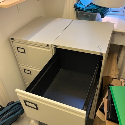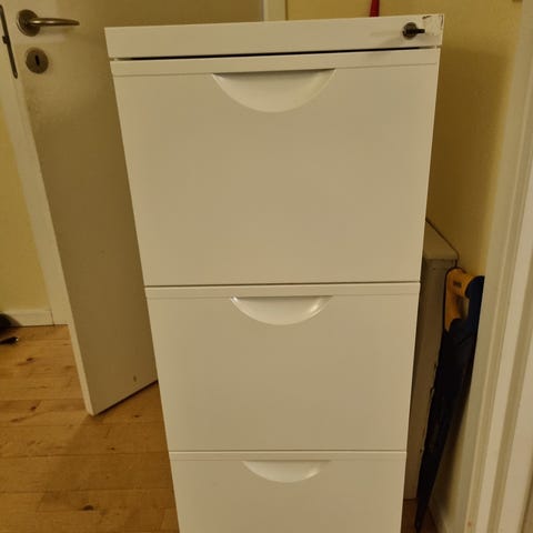 Arkivskab med 2 skuffer i hvidlakeret metal. Skabet er beregnet til hængemapper, som kan ses i den øverste skuffe. Begge skuffer har greb med etiketindsats til mærkning af indhold. Velegnet til opbevaring og organisering af dokumenter på kontor eller i hjemmet. Nøgler findes desværre ikke. Skal afhentes på adressen og bæres ned fra 1. sal (med hjælp).