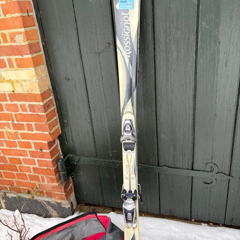 Rossignol Attraxion ski i længde 146 cm. Alpinski i hvidt design med røde detaljer. Sættet på billederne omfatter ski med monterede bindinger samt skistave og skitaske. Der medfølger også et par Salomon skistøvler (str. 24,5) og en skihjelm (str. M) i sølvfarve, som kan anvendes sammen med skiene. Velegnet til alpint skiløb på pister.