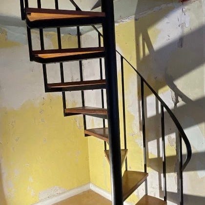 Trappen har centralsøjle i metal og buet rækværk med dekorative metalstænger.