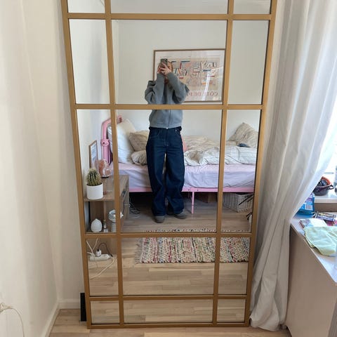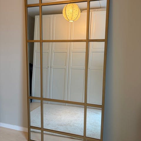 NORDAL spejl til væg. Spejlet er opdelt i felter med smalle sprosser, som giver et vindueslignende udtryk. Egnet til brug i stue, entré eller soveværelse som fuldkropsspejl eller dekorativt vægspejl. Kan hænges lodret efter ønske.