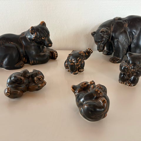 Keramik bjørnefigurer sæt i brun-sort farve.