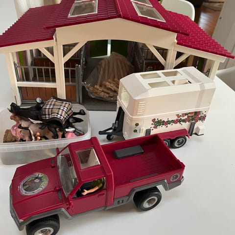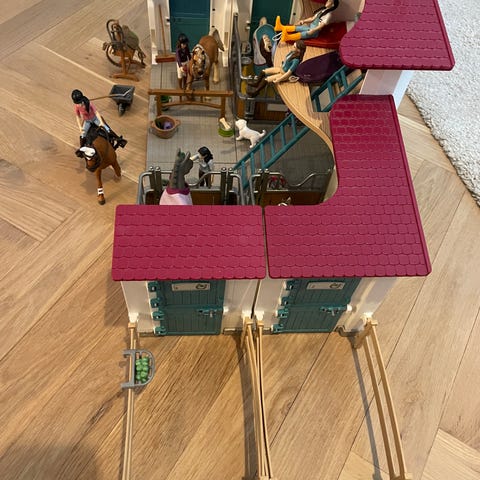 Schleich hestestald legetøjssæt. Sættet består af en stor staldbygning med flere bokse, loft med adgang via stige, udendørs indhegning samt forskellige tilbehørsdele som høballer, redskaber og figurer. Velegnet til leg med heste- og bondegårdsfigurer fra Schleich eller lignende størrelser.