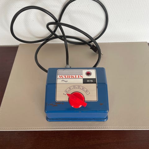 Märklin transformer til modeltog. Enheden har drejeknap på fronten til regulering af spænding og flere tilslutningsstik på siden til spor og tilbehør. Huset er i blå plast med påmonteret netledning med stik til almindelig stikkontakt. Velegnet som strømforsyning og hastighedsregulering til Märklin modeltogbaner, hvor der kræves justerbar spænding til tog og eventuelt tilbehør. Kan afhentes i Kirke Hyllinge eller Ballerup. Sendes ikke
