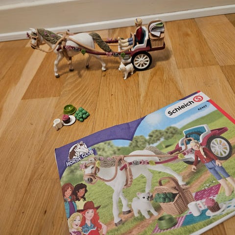 Schleich hestevogn legetøjssæt med figur. Sættet består af en detaljeret vogn med indrettet opholdsrum, tagterrasse med bord, stol og parasol, samt udendørs bålplads med træstubbe som siddepladser. Der medfølger en menneskefigur, som kan placeres forskellige steder i sættet. Velegnet til leg med heste- og bondegårdstema og kan kombineres med andre Schleich-figurer og -sæt.