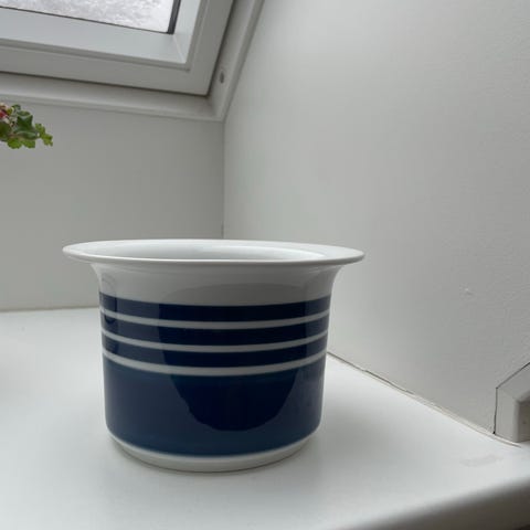 Urtepotten er lavet af hvidt porcelæn dekoreret med blå striber og fremstår som ny. Kan også anvendes som skål.