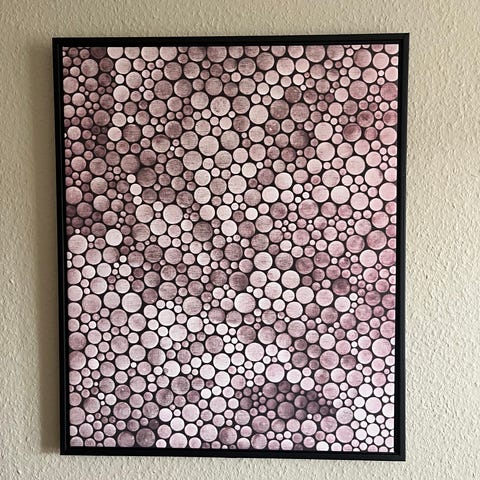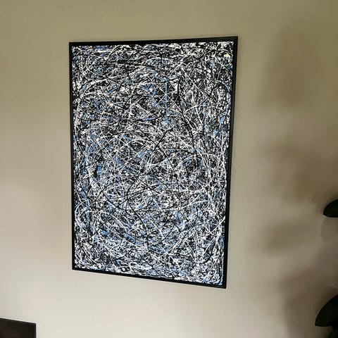Abstrakt lærredstryk. Billedet har en farvepalet bestående af grå, grønne, gule/gyldne nuancer. Det måler 73 x 108 cm inkl. ramme.