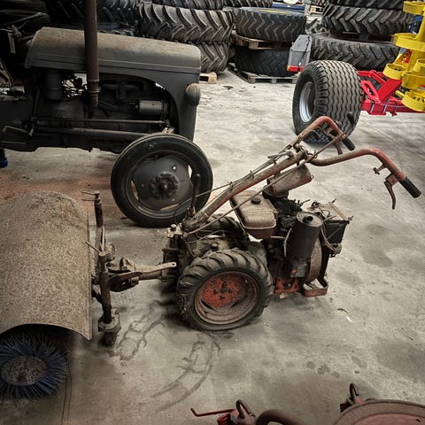 Nibbi MAK 5 med frontmonteret kost. Maskinen har grove traktormønstrede dæk og styres via styr med betjeningsgreb. Kosten er monteret foran og har en arbejdsbredde på ca. 100 cm, hvilket egner sig til fejeopgaver på gårdsplads, indkørsel eller lignende overflader. Maskinen er benzindrevet og udstyret med luftgummihjul for bedre fremdrift på ujævnt underlag.