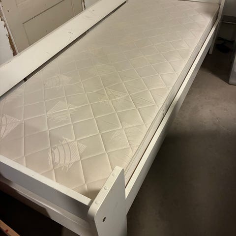 IKEA seng med springmadras i hvidt betræk. Sengen står på træben og har en enkel, polstret ramme med quiltet overflade. Egnet som enkeltseng i soveværelse, gæsteværelse eller børneværelse. Madrassen har lys, neutral farve og glat liggeflade. Passer til standard enkeltsengsmål (ca. 90 cm bredde).