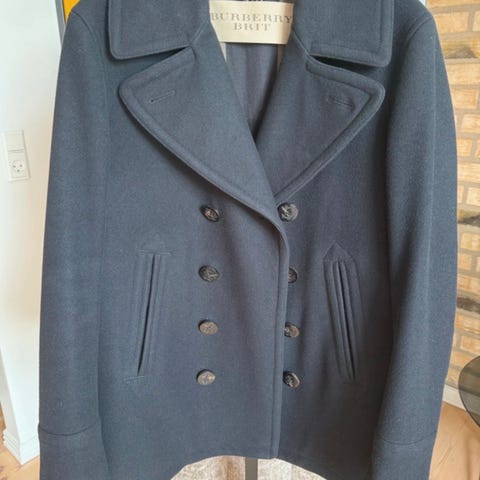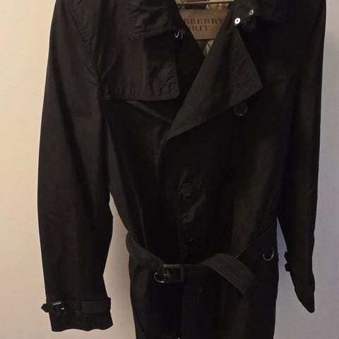 Sort Burberry uld duffelcoat med hætte, har det ikoniske tartanmønster/ternede for indvendigt.