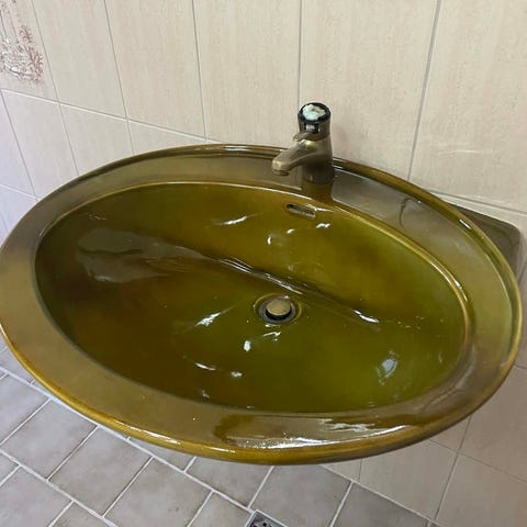 Orange badekar og håndvask i 70er stil