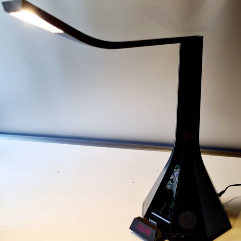 Haws Rømø bordlampe med indbygget højttaler og trådløs Qi-oplader. Enheden har rund top i trælook med betjeningsknapper til lyd på oversiden samt hvid bueformet lampe. Produktet fungerer som kombineret lampe, trådløs oplader til kompatible enheder og højttaler, egnet til brug på natbord, skrivebord eller andre indendørs områder. Helt ny kun åbnet.