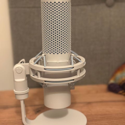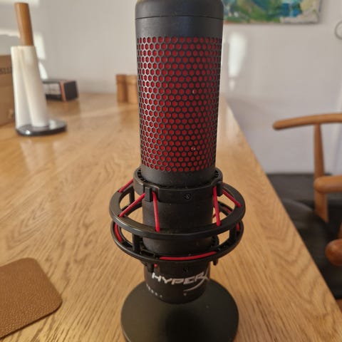 HyperX QuadCast S mikrofon i sort. USB-mikrofon med indbygget støddæmper og bordstativ. Mikrofonen har indbygget RGB-belysning og er velegnet til brug ved computer, f.eks. til streaming, gaming, online møder eller optagelse af tale. Leveres med original emballage som vist på billederne.