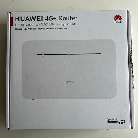 Huawei 4G+ router i hvid. Enheden har flere LAN-porte på bagsiden til kablet netværksforbindelse samt strømtilslutning. Routeren er egnet til brug med mobilt bredbånd via 4G-netværk og kan forsyne flere enheder med internetforbindelse i hjemmet eller på kontoret. Leveres med strømforsyning og netværkskabel som vist på billederne.