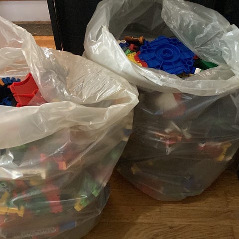 Rigtig meget flexitrax - både biler, veje, tunneller osv. Fylder en hel flyttekasse. Har været leget meget med, men samler nu bare støv.