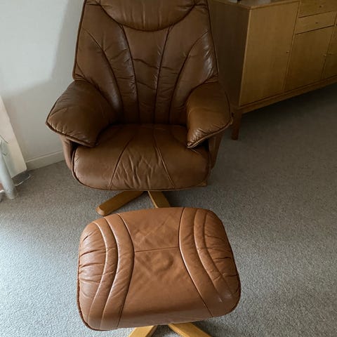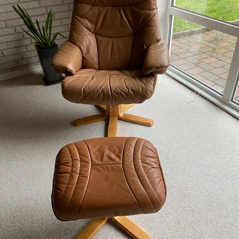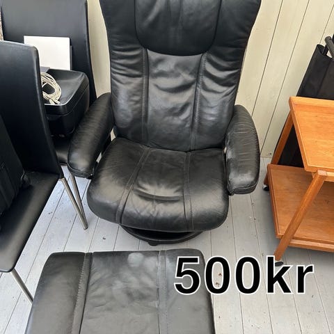 Ældre lænestol af sort lædder men man sidder stadig rigtig fint i den.