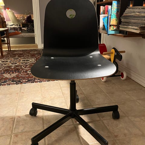Kontorstol i sort og blå polstring. Stolen har formet ryglæn og sæde med polstrede felter. Den er monteret på en femstjernet fod med hjul og har gaslift til højdejustering. Velegnet som skrivebords- eller arbejdsstol i hjemmet eller på kontor.
