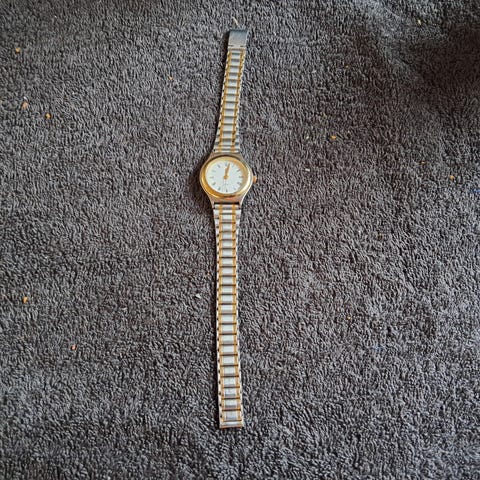 Tofarvet lænke (stål/guld-look) og guldfarvet krans. Urskiven har patina og misfarvning, hvilket giver et let vintagepræg. Uret fungerer og går som det skal.