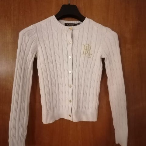 Ralph Lauren cardigan til kvinder i størrelse L. Cardiganen er hvid og strikket i bomuld med klassisk kabelstrikmønster. Den har lynlås foran, høj ribkrave, ribkanter ved ærmer og forneden samt lommer i siderne. Velegnet som let overtøj eller som ekstra lag i hverdagen.
