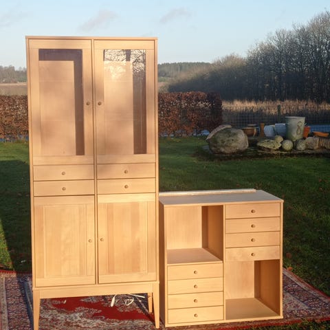 Vægmonteret vitrineskab og tilhørende skænk i brunt trælook. Øverste del består af et vitrineskab med glaslåger + indbygget lys og åbne rum. Nederste del er en skænk med låger og skuffer til lukket opbevaring. Giv evt et bud.
